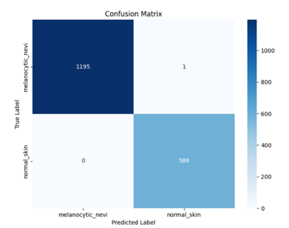 The confusion matrix provides an in-depth evaluation of the classification model's performance: True Positives (Melanocytic Nevi): 1195 samples correctly identified. True Negatives (Normal Skin): 586 samples correctly classified. False Positives: Only 1 normal skin sample misclassified as melanocytic nevi. False Negatives: 0 cases; the model consistently identified all melanocytic nevi. False Negatives: 0 cases; the model consistently identified all melanocytic nevi.